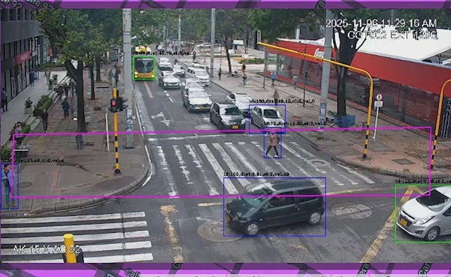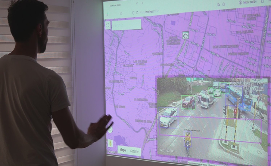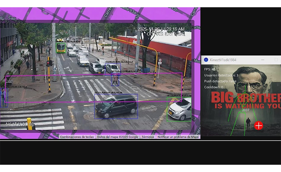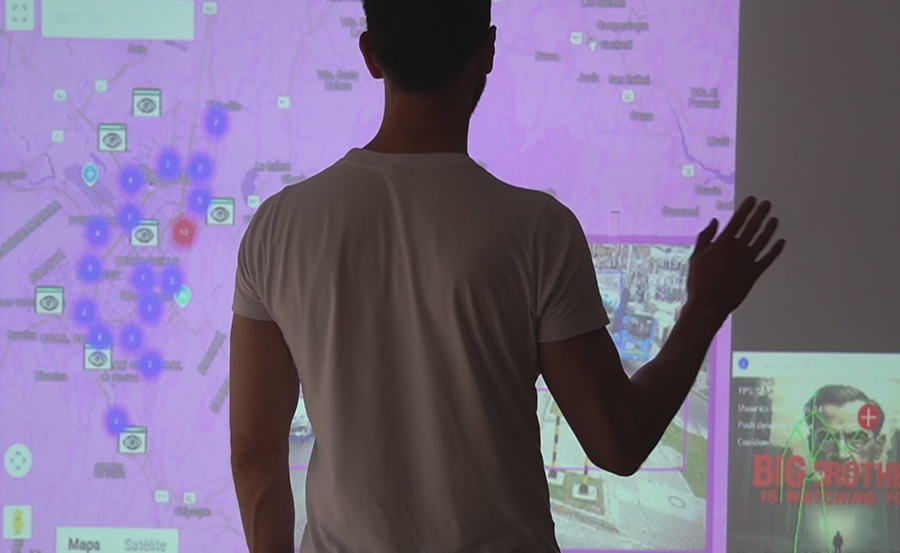 The work consists of an interactive double-projection installation where Bogotá's video surveillance system has been hacked and repurposed as a web interface displaying a city map with geolocated security cameras distributed throughout the urban territory. The viewer, transformed into a watchful eye, selects cameras through gestures captured by a Kinect sensor, manipulating the cursor in space with their hand as if summoning panoptic power. Upon pointing at a camera, the live stream unfolds before their eyes: streets, passersby, other people's lives turned into spectacle, where video analytics extract categorical information from what's being shown.